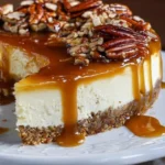 - Top with Caramel and Pecans: Once chilled, drizzle the cheesecake generously with caramel sauce and sprinkle the toasted pecans over the top.