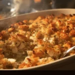 - Layer the Dish: In a greased 9×13-inch baking dish, sprinkle half of the stuffing mix evenly on the bottom. Pour the chicken mixture over the stuffing.