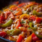 Think of it as the lazy chef’s version of stuffed peppers — all the flavor, none of the fuss. Instead of painstakingly filling each pepper, everything cooks together in one skillet, creating a rich and savory medley of ground meat, rice, tomatoes, and tender bell peppers.