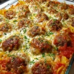- In a large baking dish, add the frozen meatballs, the cooked pasta, and pour the marinara sauce over the top, mixing it all until the meatballs and pasta are evenly coated.