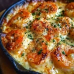 - Pour the shrimp and sauce mixture into a greased baking dish. Sprinkle the remaining Parmesan cheese and breadcrumbs on top.